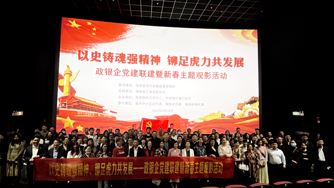 為發(fā)揮黨建引領(lǐng)作用,加強(qiáng)政銀企溝通互動,近日,海南股交聯(lián)合中信銀行??诜中虚_展“以史鑄魂強(qiáng)精神、鉚足虎力共發(fā)展”政銀企黨建聯(lián)建暨新春主題觀影活動。此次活動得到了海南省地方金融監(jiān)督管理局、海南省工商業(yè)聯(lián)...