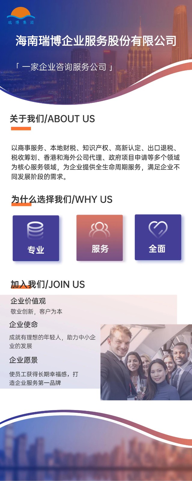 | 企業(yè)說明: | 海南瑞博企業(yè)服務(wù)股份有限公司是瑞博集團(tuán)下屬子公司,自2018年海南自貿(mào)港開放以來。瑞博集團(tuán)積極響應(yīng)國家的號召,通過充分考察后,于海南省??谑谐闪⒑D先鸩┢髽I(yè)服務(wù)股份有限公司,主要以商事服務(wù)、本地財(cái)稅、知識(shí)產(chǎn)權(quán)、高新認(rèn)定、出口退稅、稅收籌劃、香港和海外公司代理、政府項(xiàng)目申請等多個(gè)領(lǐng)域?yàn)楹诵姆?wù)領(lǐng)域,為企業(yè)提供全生命周期服務(wù),滿足企業(yè)不同發(fā)展階段的需求。 瑞博集團(tuán)下屬直營子公司分部在北京、西安、海南、香港等地,全國主要一二線城市的分部陸續(xù)成立中,跨區(qū)域配合,輻射全國,以滿足客戶跨區(qū)域服務(wù)需求;同時(shí)瑞博持續(xù)拓展延伸資源合作平臺(tái),引入各類商業(yè)服務(wù)機(jī)構(gòu)供應(yīng)鏈合作機(jī)構(gòu),打通了產(chǎn)業(yè)鏈上下游領(lǐng)域的立體服務(wù)生態(tài),企業(yè)全品類服務(wù)能力,得到了廣大的客戶的認(rèn)可與信賴。 |