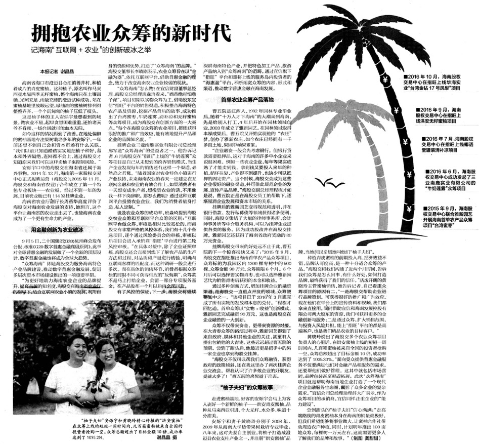 中國人民銀行唯一直屬刊物《金融時報》近整版報道了海南股權(quán)交易中心“眾籌海南”項目,文章以《擁抱農(nóng)業(yè)眾籌的新時代 記海南“互聯(lián)網(wǎng)+農(nóng)業(yè)”的創(chuàng)新破冰之舉》為題,圍繞數(shù)字普惠金融、“互聯(lián)網(wǎng)+農(nóng)業(yè)”創(chuàng)新等內(nèi)容展開。