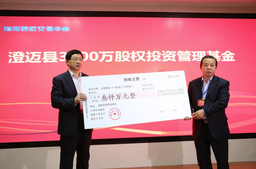 為了加強(qiáng)澄邁縣與股交中心的合作,現(xiàn)場,鄭奮與李曉剛共同簽署了戰(zhàn)略合作協(xié)議。隨后,楊思濤代表澄邁縣政府向海南控股發(fā)放澄邁縣3000萬股權(quán)投資管理資金,并由柳松華代表海南控股接收。