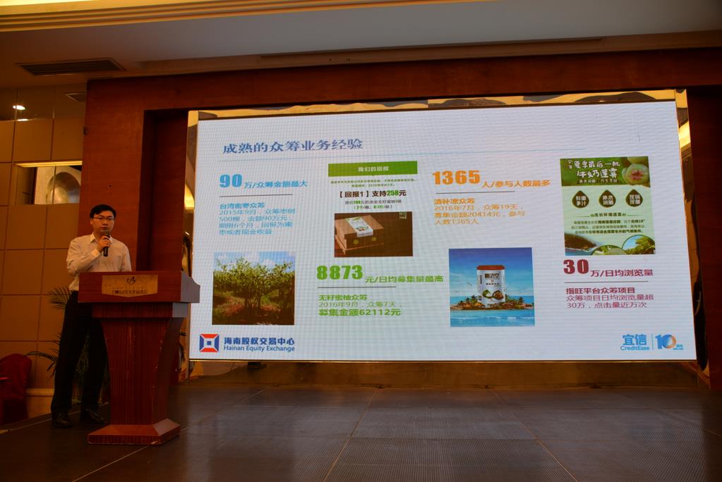 隨后,股交中心副總經(jīng)理程棟才就2017年度“眾籌海南,訂制農(nóng)旅”項目情況及具體內(nèi)容作了詳細的介紹,指出此次股交中心推出“眾籌海南,訂制農(nóng)旅”項目目的在于聚焦海南特色資源,推廣海南特色農(nóng)產(chǎn)品,促進農(nóng)旅融合,進一步推動企業(yè)發(fā)展。