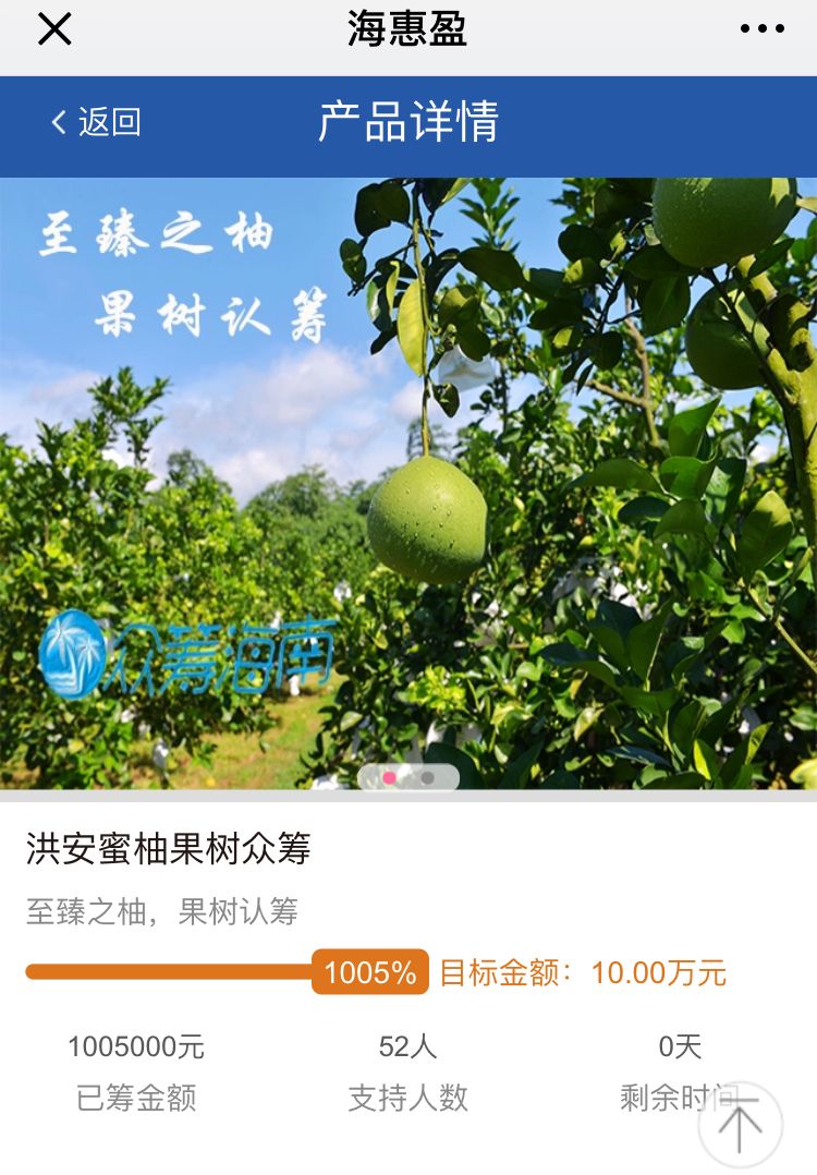 去年底,為了幫助企業(yè)解決短期資金流轉(zhuǎn)問題,海南股權(quán)交易中心聯(lián)合掛牌企業(yè)澄邁洪安農(nóng)業(yè)開發(fā)有限公司發(fā)起了存續(xù)期為9個(gè)月的“洪安蜜柚果樹眾籌”項(xiàng)目,項(xiàng)目在股交中心綜合金融服務(wù)平臺(tái)“海惠盈”發(fā)布后短時(shí)間內(nèi)達(dá)成了募集資金目標(biāo),最終募集金額達(dá)100.5萬元。