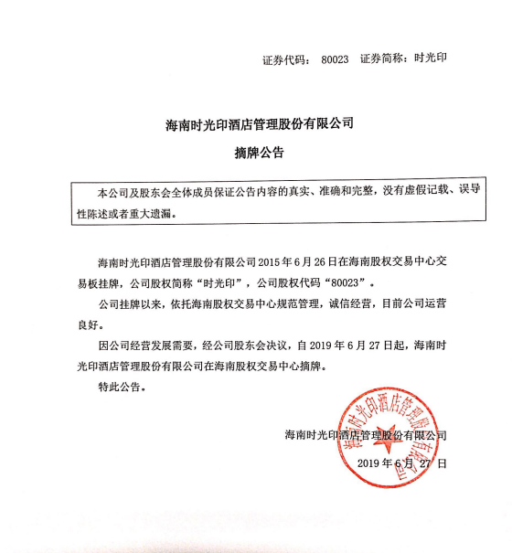 80023 海南時光印酒店管理股份有限公司:摘牌公告