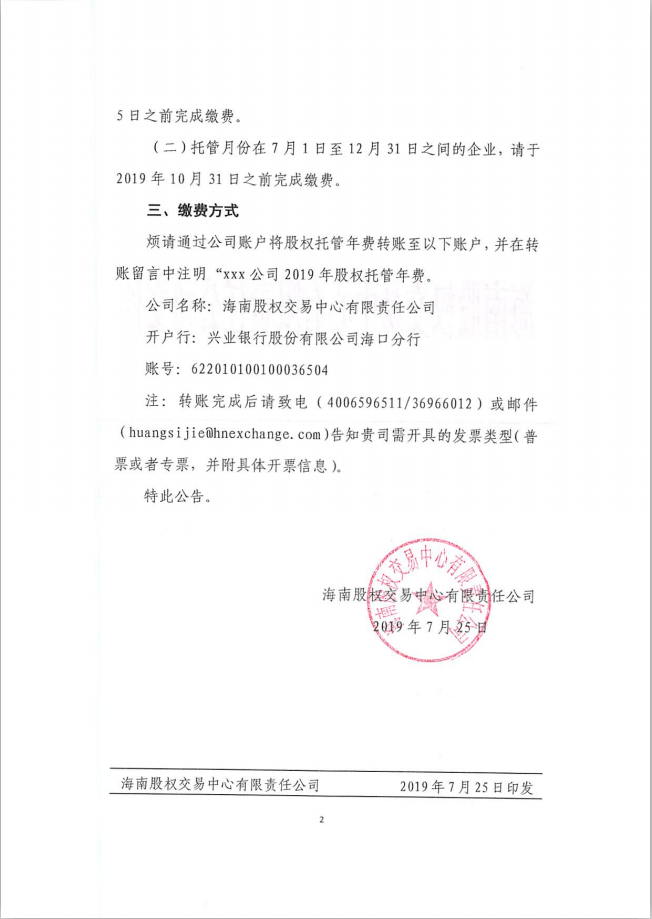 海南股權(quán)交易中心有限責(zé)任公司關(guān)于托管企業(yè)繳納2019年股權(quán)托管年費的通知
