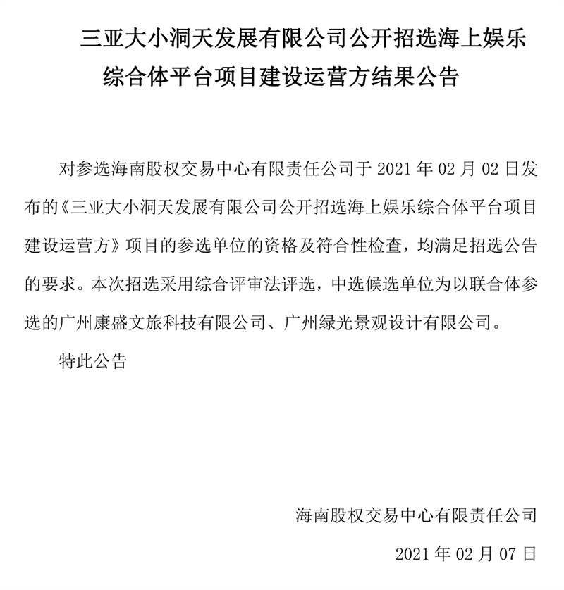 三亞大小洞天發(fā)展有限公司公開招選海上娛樂綜合體平臺項目建設(shè)運營方結(jié)果公告