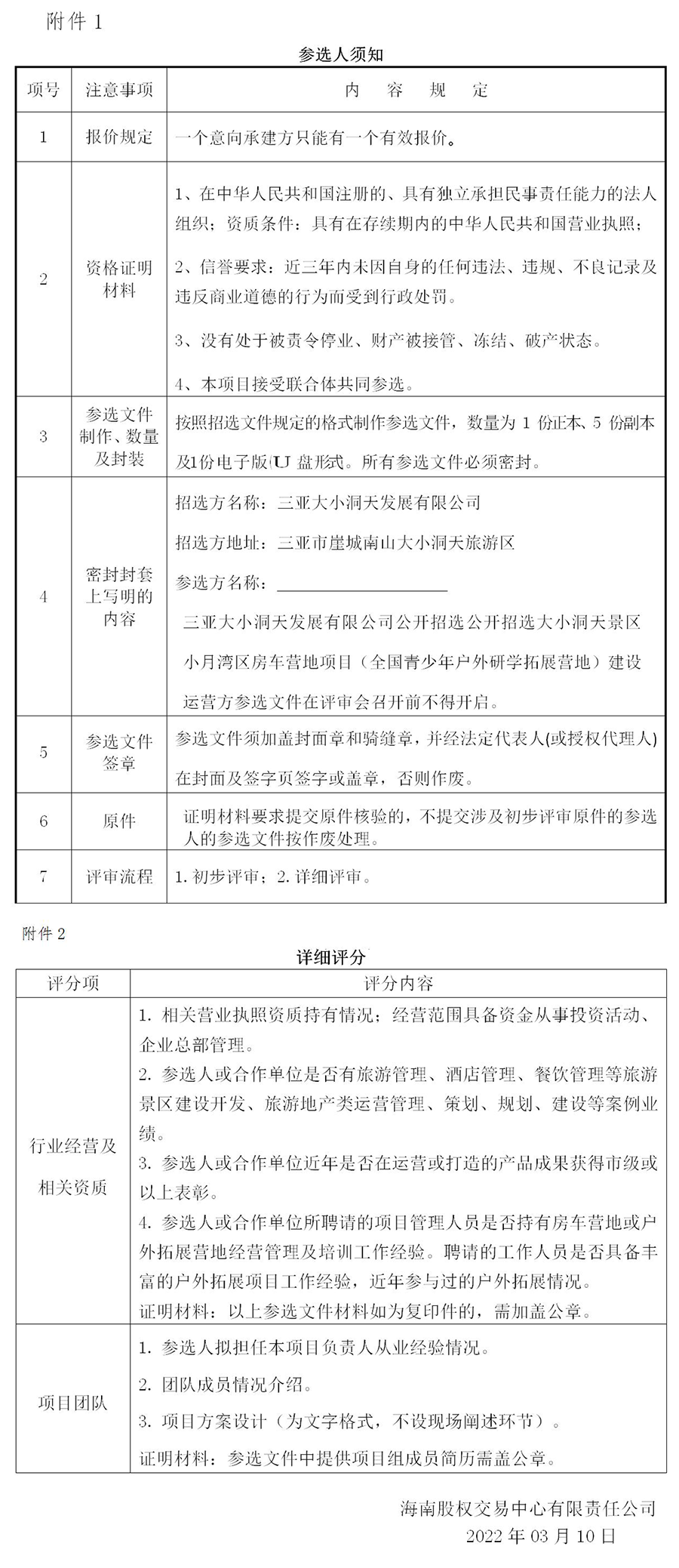 三亞大小洞天發(fā)展有限公司公開招選小月灣區(qū)房車營地項目(全國青少年戶外研學拓展營地)建設運營方