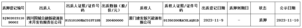 海南國城常青投資合伙企業(yè)(有限合伙)(企業(yè)代碼:993906)合伙人“四川國城合融新能源技術(shù)開發(fā)有限責任公司”于2023年11月9日在我中心辦理了財產(chǎn)份額質(zhì)押登記業(yè)務(wù),具體情況如下: