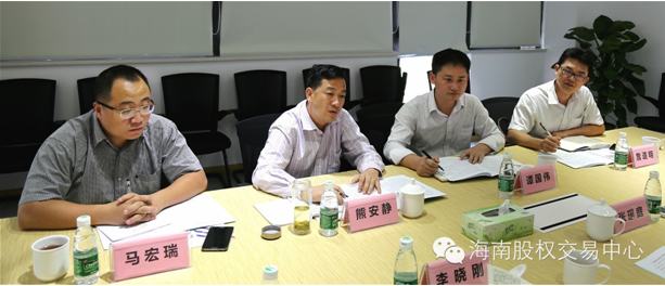 4月13日下午,由海南省人民政府研究室副主任熊安靜帶隊(duì)的省金融辦、省旅游委調(diào)研組一行,到海南股權(quán)交易中心走訪調(diào)研。海南股權(quán)交易中心董事長(zhǎng)李曉剛,組織各部門負(fù)責(zé)人召開座談會(huì),詳細(xì)介紹了本中心的運(yùn)行情況。