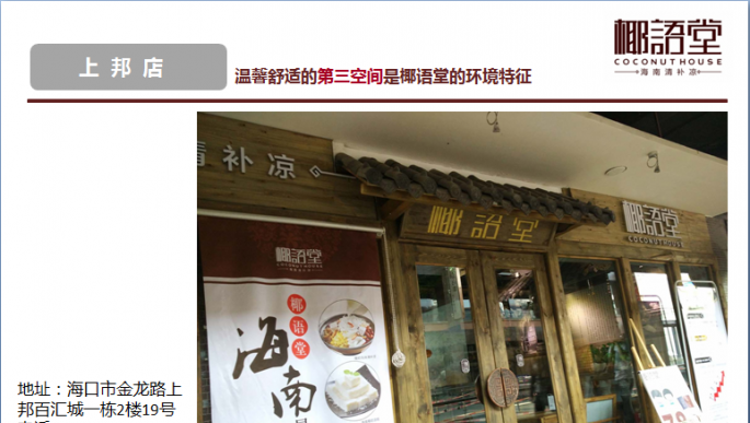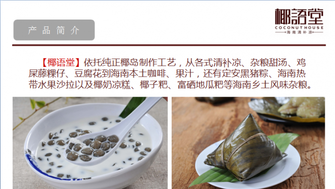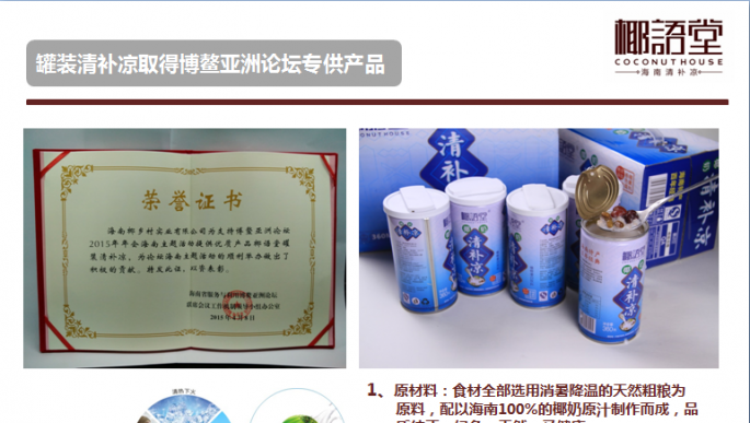 海南椰鄉(xiāng)村實(shí)業(yè)有限公司是海南省工商行政管理局批準(zhǔn)成立的有限責(zé)任公司,公司注冊資金2300萬,在職員工103人。公司下轄全資子公司??谝Z堂餐飲文化有限公司及??谝Z堂食品營養(yǎng)科學(xué)研究院。公司根據(jù)發(fā)展目前分為三個(gè)事業(yè)部:椰語堂店面連鎖事業(yè)部、產(chǎn)品事業(yè)部、椰語堂食品營養(yǎng)科學(xué)研究院。椰語堂店面連鎖事業(yè)部主要負(fù)責(zé)椰語堂連鎖店面的擴(kuò)張和關(guān)聯(lián)產(chǎn)業(yè)的拓展業(yè)務(wù);產(chǎn)品事業(yè)部主要負(fù)責(zé)以罐裝清補(bǔ)涼等快消品市場的開拓,如目前所進(jìn)行的椰語堂椰奶清補(bǔ)涼工業(yè)化項(xiàng)目就是最具代表性的一項(xiàng)研究工作;椰語堂食品營養(yǎng)科學(xué)研究院主要為椰語堂本身和第三方進(jìn)行有關(guān)食品營養(yǎng)、配餐、產(chǎn)品研發(fā)等方面的工作,未來是椰語堂核心競爭力的重要部分。 椰語堂是海南首家把海南本土以清補(bǔ)涼為代表的小吃精致化、系統(tǒng)化、標(biāo)準(zhǔn)化和研發(fā)體系化并進(jìn)行連鎖發(fā)展的企業(yè),公司致力于傳播海南文化、打造海南本土休閑美食的第一品牌。公司成立于2012年,并創(chuàng)立【椰語堂】品牌, 現(xiàn)已在海南望海國際廣場、南亞廣場、中山路騎樓老街、美蘭國際機(jī)場、上邦商業(yè)廣場、天涯海角景區(qū)、??谀蟻啅V場、廣東中山市、??趪Q(mào)大道正昊店、三亞亞龍灣熱帶天堂森林公園、海口友誼廣場店等地開設(shè)11家連鎖店并開始北京、天津、遼寧、江蘇等島外市場的拓展,由于其濃郁的海南本土特色和優(yōu)秀的品質(zhì)感受到社會各界的廣泛好評,椰語堂椰奶清補(bǔ)涼等六款小吃被餐飲行業(yè)權(quán)威機(jī)構(gòu)海南省烹飪協(xié)會、海南省瓊菜研究中心評為海南名小吃和海南瓊菜(風(fēng)味小吃)一級品牌名店。央視CCTV-2、旅游衛(wèi)視、海南電視臺、內(nèi)蒙衛(wèi)視、海南日報(bào)、航空高端雜志【云端】、中國美食第一刊【東方美食】【餐飲經(jīng)理人】、【勇闖地球主持人伊恩.萊特】、【新浪美食】、【南島視界】、【海南旅游商品協(xié)會雜志創(chuàng)刊號】、去哪兒吃【海南美食】食尚海南等國內(nèi)外知名媒體都進(jìn)行了宣 傳報(bào)道,成為了海南文化的傳播和弘揚(yáng)者,并打造成展示海南國際旅游島本土文化的一張亮麗名片。 海南椰鄉(xiāng)村實(shí)業(yè)有限公司注冊成立了“海口椰語堂食品營養(yǎng)科學(xué)研究院”并和海南大學(xué)食品學(xué)院深度合作,充分利用海南大學(xué)食品學(xué)院的科研力量和實(shí)驗(yàn)設(shè)備,集結(jié)了海南大學(xué)和其它領(lǐng)域的教授、專家,進(jìn)行產(chǎn)品的研發(fā)和標(biāo)準(zhǔn)的制定,定期進(jìn)行營養(yǎng)成分抽檢和出品品質(zhì)監(jiān)控,旨在為消費(fèi)者提供食品更加安全、營養(yǎng)更加豐富、品種更加齊全的海南本土特色休閑美食。 2014年,政府為發(fā)展海南省地方特色產(chǎn)業(yè),從眾多的申報(bào)項(xiàng)目中篩選后對我司進(jìn)行了300萬人民幣股權(quán)投資。 2014年12月,我司受邀參加2014年中國(海南)國際熱帶農(nóng)產(chǎn)品冬季交易會,我司推出的“椰語堂罐裝清補(bǔ)涼”在海南省品牌館和海口市品牌館進(jìn)行展示。本產(chǎn)品原材料全部選用消暑降溫的天然粗糧為原料,配以海南100%的椰奶原汁制作而成,品質(zhì)純正、綠色、天然又健康,清涼可口、營養(yǎng)又健康。通過此次展會,“椰語堂罐裝清補(bǔ)涼”贏得了島內(nèi)外顧客的一致好評,成為此次冬交會上獨(dú)具一格的風(fēng)景。 2015年3月,我司“椰語堂罐裝清補(bǔ)涼”正式成為亞洲博鰲論壇專供產(chǎn)品,為世界各國領(lǐng)導(dǎo)人所品用。 目前在??跈C(jī)場、??谥寥齺唲?dòng)車、廣深高鐵、部分商場、淘寶等互聯(lián)網(wǎng)渠道已經(jīng)開始椰語堂灌裝清補(bǔ)涼產(chǎn)品的銷售。 |